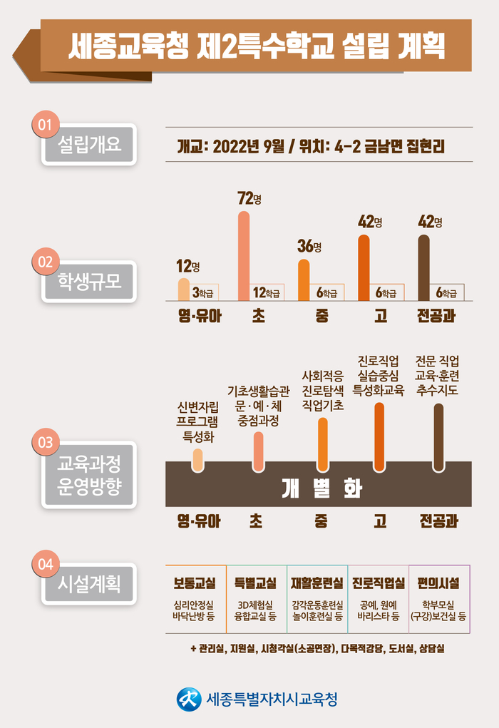 세종시 금남면 집현리 619번지 일대에 들어서는 이 학교는 유-초-중-고교에 전공과를 더한 특성화 교육과정을 운영하여 발달단계별 균형 있는 특수교육 기회를 제공한다는 방침이다.