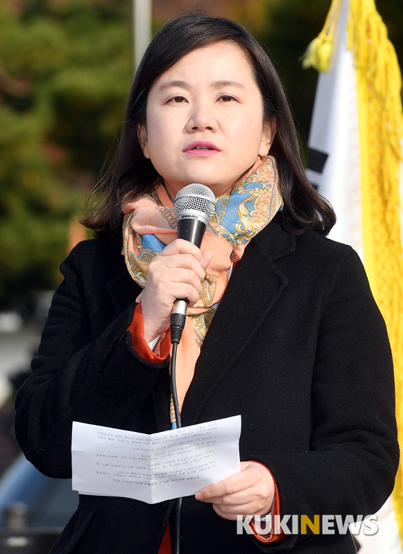 자유한국당 신보라 의원이 21일 청와대 앞 분수대 광장에서 열린 최고위원회의에서 발언하고 있다.