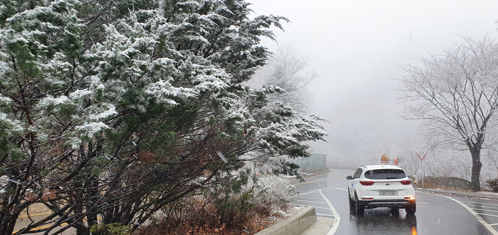 강원 산간에 눈이 내린 25일 한계령에 한겨울 풍경이 연출되고 있다.