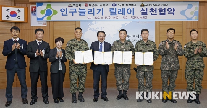 27일 익산시는 육군부사관학교와 7공수 특전여단, 제9585부대 3대대 등 3개 군부대와 인구 늘리기 실천 협약을 체결했다. 협약식에는 김한태 육군부사관학교장, 이홍철 7공수 특전여단 참모장(여단장 직무대리), 최민호 제9585부대 3대대장이 참석했다.