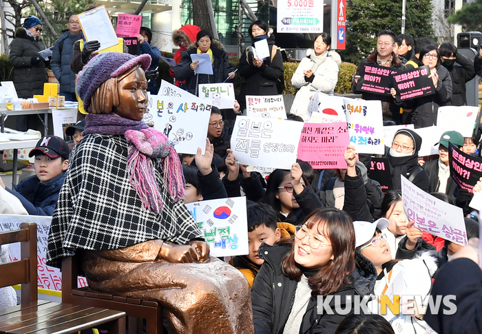 추운 날씨에도 소녀상 옆에서 구호 외치는 시민들