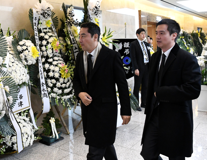 가로세로연구소 강용석 변호사(왼쪽)가 10일 오후 경기도 수원시 아주대병원 장례식장에 마련된 김우중 전 대우그룹 회장 빈소를 찾아 조문하고 있다.