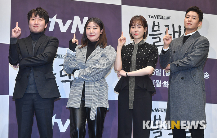 배우 이창훈과 라미란, 서현진, 하준이 11일 오후 서울 경인로 라마다 서울신도림호텔에서 열린 TVN 월화드라마 '블랙독' 제작발표회에 참석해 포즈를 취하고 있다.