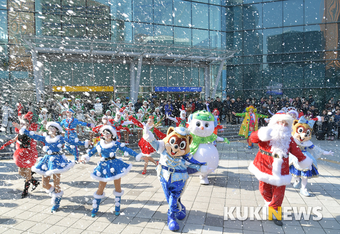 크리스마스를 일주일 앞둔 18일 오후 서울역 광장에서 롯데월드 어드벤처 공연팀이 미니 크리스마스 공연을 선보이고 있다.