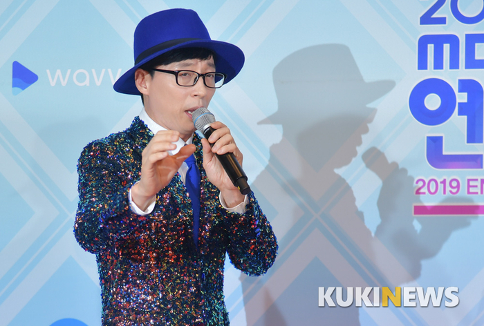 개그맨 유재석이 29일 오후 서울 상암동 MBC 미디어센터에서 열린 '2019 MBC 방송연예대상' 포토월 행사에서 유산슬의 곡을 선보이고 있다.