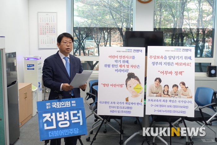 전병덕 대전중구 국회의원예비후보(민주당)는 30일 오전 대전시의회 기자실에서 2차 정책발표회를 갖고, “보육정책 관련 ‘어부바 프로젝트’ 추진과 어린이 안전 관련 ‘방탄 어린이법’ 제정을 위한 노력을 기울일 것”이라고 밝혔다.