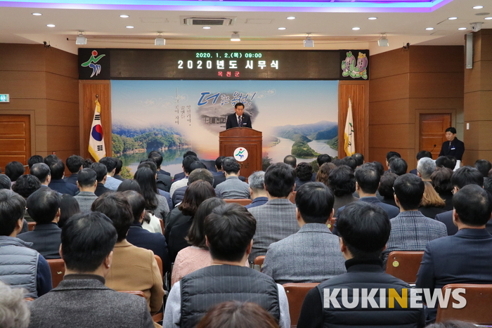 김재종 충북 옥천군수는 2일 옥천군청 대회의실에서 열린 새해 시무식에서 “지속적인 신 성장 동력 창출로 미래 먹거리를 선점해 나갈 것”이라고 말했다(사진).