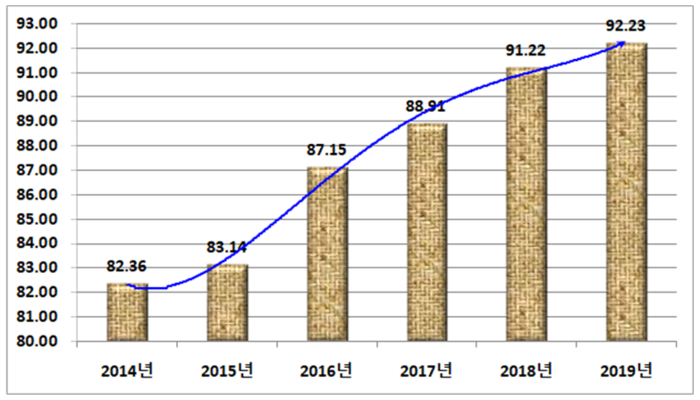 대전시는 외부기관 용역을 통해 지난해 시내버스 서비스 평가를 실시한 결과 92.23점으로 조사됐다고 6일 밝혔다. 이는 2018년 91.22점에 이은 A등급이다. 그 이전의 시내버스 서비스 평가점수를 보면, 2014년 82.36점, 2015년 83.14점, 2016년 87.15점, 2017년 88.91점 등이다.