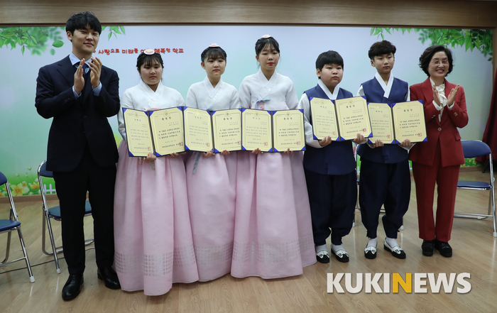 7일 오전 DMZ내에 위치한 대성동초등학교 졸업식에서 올해의 졸업생 5명이 졸업장을 받은 후 선생님과 함께 기념촬영을 하고 있다.