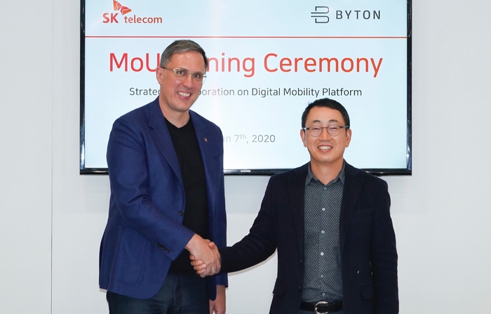SK텔레콤은 7일(미국 현지시간) 미국 라스베이거스 CES 2020 현장에서 SK텔레콤 유영상 MNO사업부장과 바이톤 다니엘 키르헤르트 CEO가 참석한 가운데 바이톤의 한국 출시 전기차 대상 양사의 포괄적인 협력을 목표로 상호 양해각서(MoU)를 체결했다고 밝혔다.