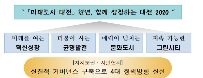 대전시는 올해 추진할 역점과제를 '미래를 여는 혁신성장', '서로를 보는 균형발전', '매력 넘치는 문화도시', '지속 가능한 그린시티' 등 4가지로 정해 추진한다고 9일 발표했다.