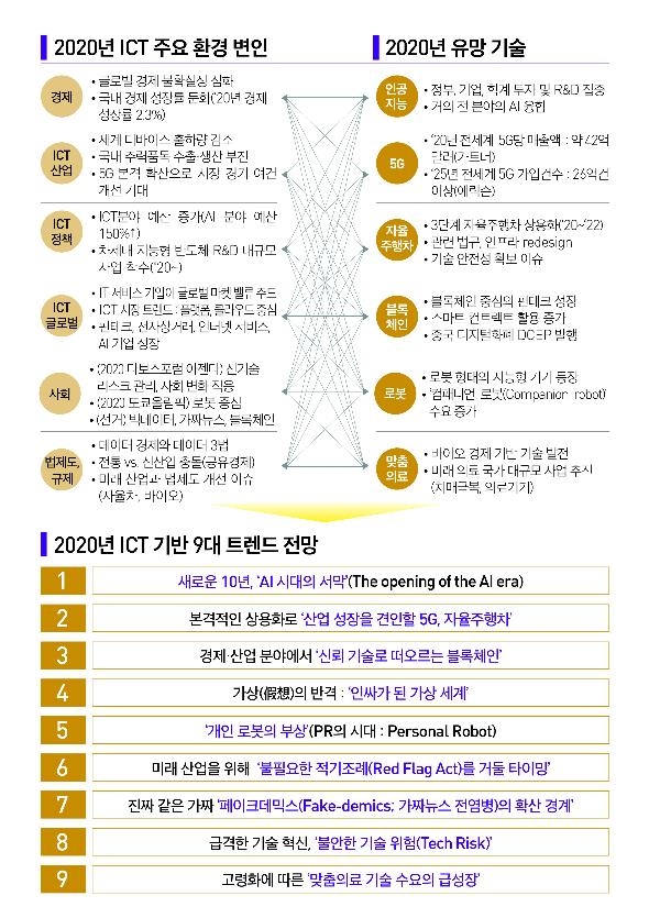 '2020년 ICT 9대 트렌드'로는 ▲ AI 시대의 서막 ▲ 산업 성장을 견인할 5G, 자율주행차 ▲ 신뢰 기술로 떠오르는 블록체인 ▲ '인싸'가 된 가상 세계 ▲ 개인 로봇의 부상 ▲ 불필요한 적기조례(Red Flag Act)를 거둘 타이밍 ▲ 페이크데믹스(Fake-demics·가짜뉴스 전염병)의 확산 경계 ▲ 불안한 기술 위험(Tech Risk) ▲ 맞춤의료 기술 수요의 급성장이 뽑혔다.