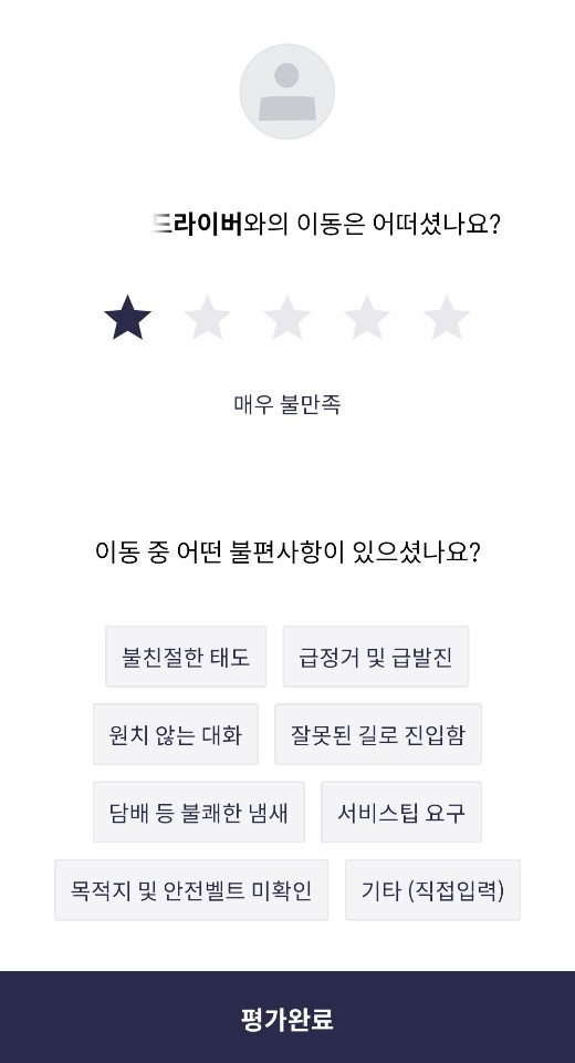 이야기를 나누는 사이 목적지에 도착했다. 앱에서 미리 등록한 카드를 통해 자동으로 결제가 완료되어 편리했다. 도착과 함께 운전사의 서비스에 따라 별점을 매긴다. 별을 1~4개로 적게 주면 이동 불친절한 태도, 급정거 급발진 등 불편사항을 선택하게 된다. 별점제를 이용해 서비스의 질을 유지하고 있음을 알 수 있었다.
