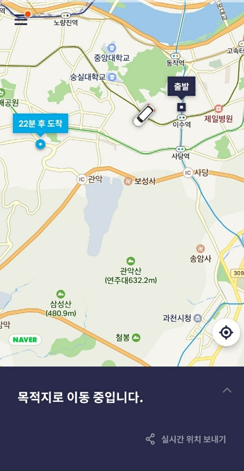 출발지 사당동, 목적지 신림동을 입력하고 타다를 불렀다. 차가 지정되자마자 내가 타게 될 차의 운전자 이름과 차의 번호를 확인할 수 있고, 지도에서 자동차 모양의 아이콘으로 내가 탈 차의 위치에 대한 실시간 확인이 가능했다.