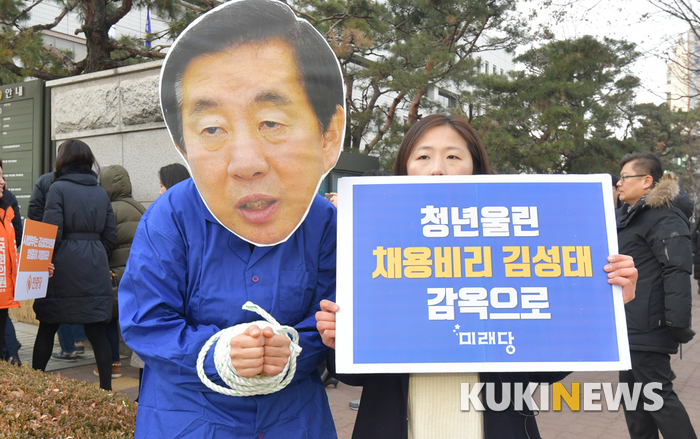 미래당 당원들이 17일 오전 서울 양천구 서울남부지방법원에서 KT에 딸 채용을 청탁(뇌물수수)한 혐의로 1심 선고 공판에 출석하는 김성태 자유한국당 의원의 처벌을 촉구하는 퍼포먼스를 하고 있다.