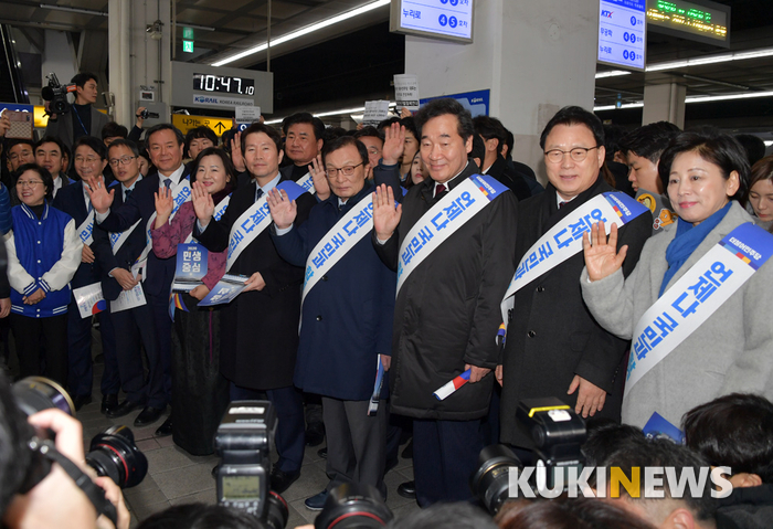 이해찬 더불어민주당 대표, 이인영 원내대표, 이낙연 전 국무총리 등이 설 연휴를 하루 앞둔 23일 오전 용산역 플랫폼에서 귀성객들에게 설 인사를 하고 있다.