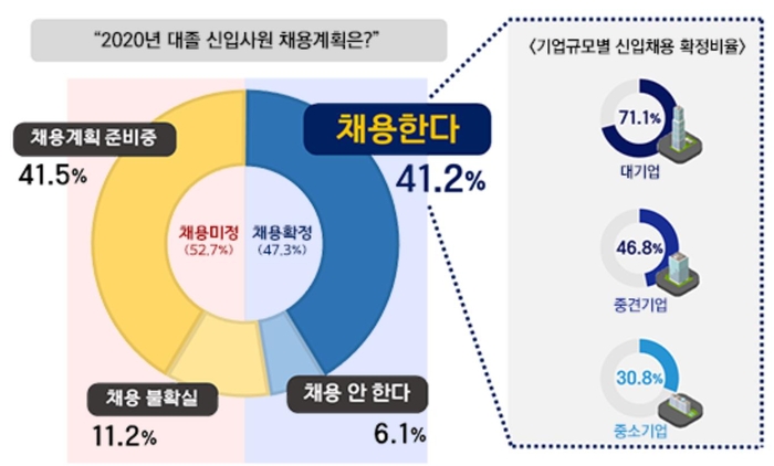 채용계획이 미정이라고 응답한 기업(52.7%) 가운데 41.5%는 '채용 의향은 있지만, 세부적인 계획은 미정'이라고 답했으며 11.2%는 채용 자체가 불확실하다고 밝혔다.