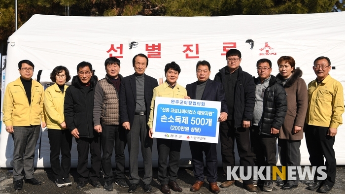 [완주=쿠키뉴스] 소인섭 기자 = 완주군 이장협의회(회장 황호년)가 보건소 선별진료소 현장을 찾아 200만원 상당의 손소독제를 기증했다. 신종 코로나바이러스 확산 방지를 위해 힘을 보탠 것이다.