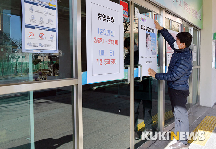 [쿠키뉴스] 박효상 기자 = 서울시교육청이 서울 중랑·성북구 지역 유치원과 초·중·고교 등 총 42곳에 대해 오는 13일까지 긴급 휴업 명령을 내린 6일 서울 성북구 삼선중학교에서 관계자가 휴업을 알리는 안내문을 붙이고 있다.