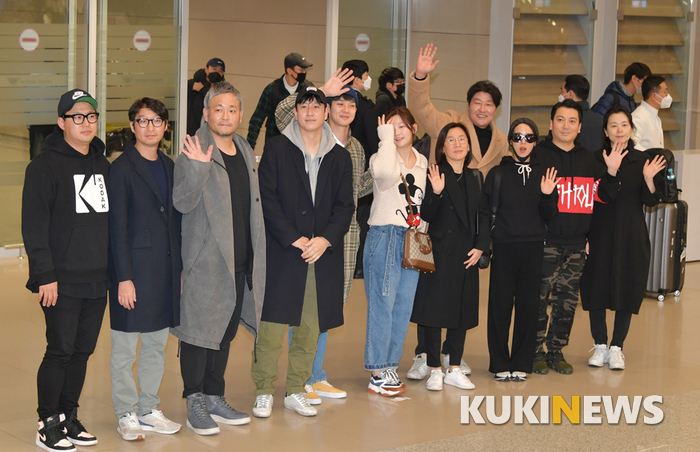 [쿠키뉴스] 박효상 기자 = 영화 '기생충'의 제작진과 배우들이 12일 오전 인천국제공항에서 포즈를 취하고 있다. 이날 봉준호 감독을 제외하고 제작자 곽신애 대표를 비롯해 한진원 작가 등 현지 시상식에 참석한 스태프들과 배우 송강호, 최우식, 이선균, 조여정, 박소담, 장혜진, 박명훈까지 11인이 입국했다.