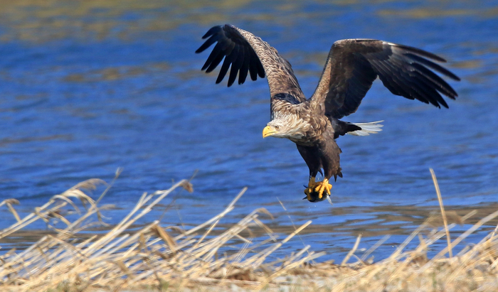 [쿠키뉴스] 박효상 기자 = 14일 강원 강릉시 남대천 일원에서 월동 중인 천연기념물 제243-4호 흰꼬리수리가 커다란 물고기 사냥을 한 뒤 날고 있다.