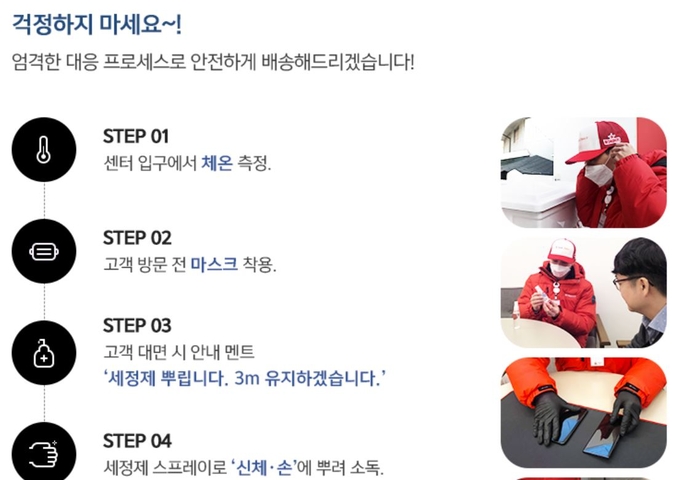 SK텔레콤은 오늘도착 서비스를 이용하면서도 코로나19를 염려하는 고객을 위해 엄격한 대응 프로세스로 안전한 배송을 약속했다. t월드에서는 코로나19 예방을 위한 오늘도착 프로세스를 고객에게 고지하고 있다.