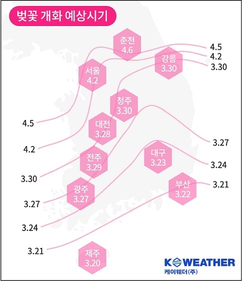 [쿠키뉴스] 이영수 기자 = 케이웨더는 올해 벚꽃 개화 시기는 지역별로 다소 차이는 있으나, 남은 2월과 3월 기온이 평년보다 높을 것으로 전망됨에 따라 5~8일 가량 빠를 것으로 예상했다.