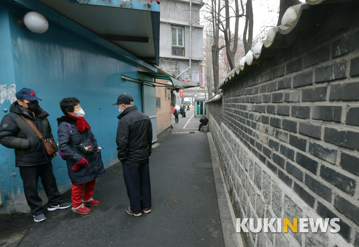 [쿠키뉴스] 박효상 기자 = 21일 오전 코로나19 확산 방지를 위해 운영을 중단한 탑골공원 옆에서 어르신들이 이야기를 ㄴ 나누고 있다.
