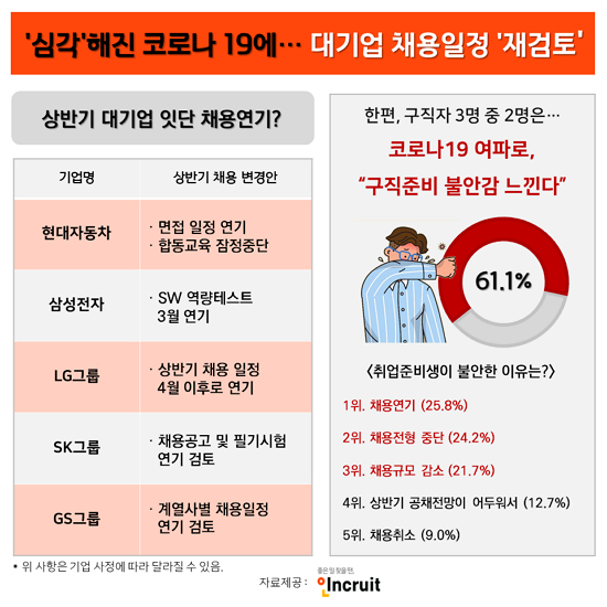 한편 삼성전자는 3급 대졸 신입사원 공개채용에서 가산점을 받을 수 있는 소프트웨어(SW)역량테스트를 지난 15일에서 다음 달로 연기했다. LG는 올해 신입사원 공채일정을 4월 이후로 연기하고, SK 및 GS그룹 역시 계열사별 채용일정을 연기하거나 재고한다는 입장이다.