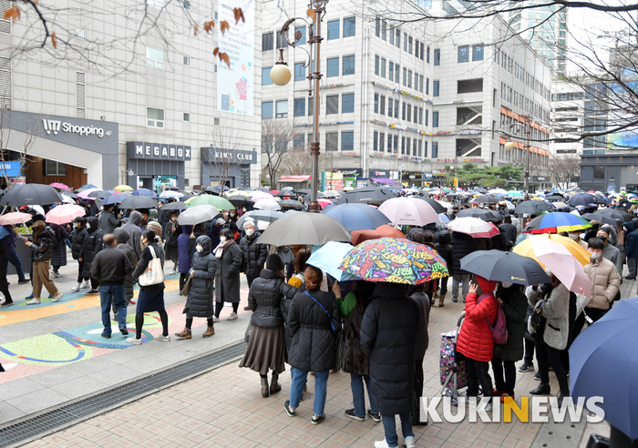[쿠키뉴스] 박효상 기자 = 코로나19 확진자가 이천 명을 넘어선 28일 서울 양천구 행복한백화점 앞에 시민들이 마스크를 구매하기 위해 줄 서 기다리고 있다.