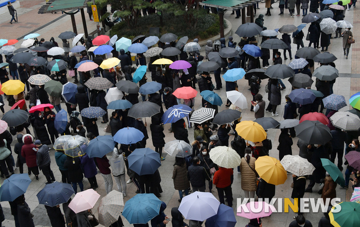 [쿠키뉴스] 박효상 기자 = 코로나19 확진자가 이천 명을 넘어선 28일 서울 양천구 행복한백화점 앞에 시민들이 마스크를 구매하기 위해 줄 서 기다리고 있다.