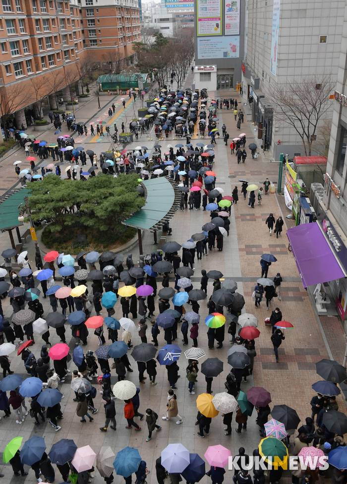 [쿠키뉴스] 박효상 기자 = 코로나19 확진자가 이천 명을 넘어선 28일 서울 양천구 행복한백화점 앞에 시민들이 마스크를 구매하기 위해 줄 서 기다리고 있다.