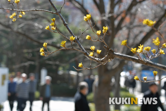 [쿠키뉴스] 박효상 기자 = 절기상 경칩인 5일 오후 서울 종로구 세종문화회관 인근에 산수유꽃이 피어있다.