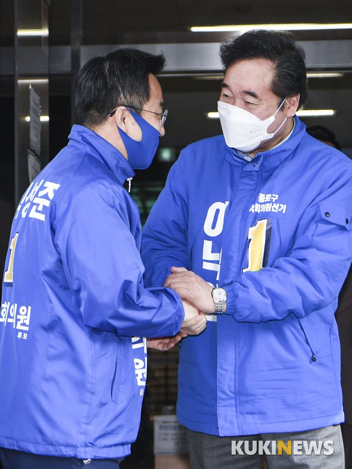 [쿠키뉴스] 박효상 기자 = 이낙연 더불어민주당 공동상임선대위원장이 26일 오전 서울 종로구 선거관리위원회에서 박성준 후보(왼쪽)과 악숙하고 있다.