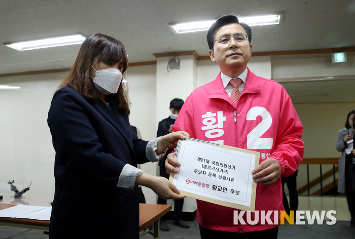 [쿠키뉴스] 박효상 기자 = 황교안 미래통합당 대표가 26일 오전 서울 종로구 선거관리위원회에서 21대 총선 후보등록을 하고 있다