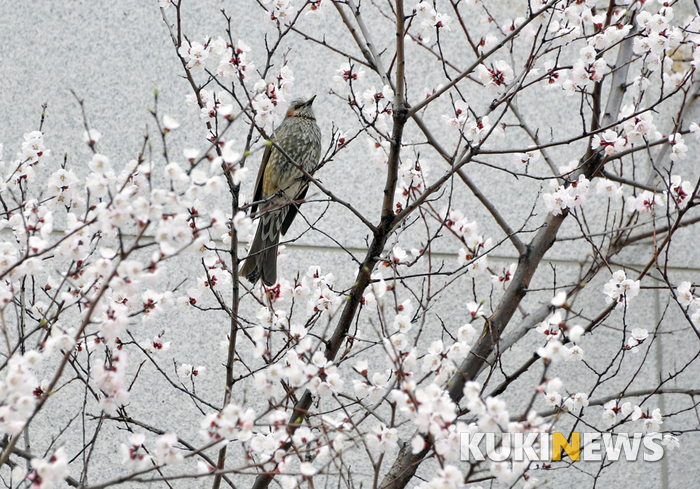 [쿠키뉴스] 박효상 기자 = 완연한 봄 날씨를 보인 27일 오후 서울 종로구 한 거리에 심어진 매화나무에 직박구리가 앉아 있다.