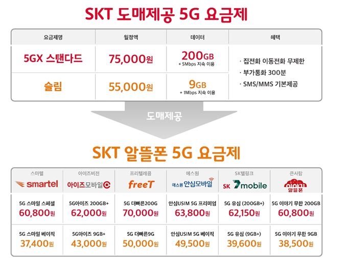 SK텔레콤이 알뜰폰에 도매로 제공하는 5G요금제는 '5GX 스탠다드'와 '슬림' 2가지다. 특히, '슬림' 요금제의 도매 제공으로 월 3만원대에 SK텔레콤 5G 서비스를 이용하는 5G 알뜰폰 요금제 출시가 가능해졌다. 5G알뜰폰 요금제가 제공하는 기본 데이터 등 모든 혜택은 SK텔레콤 모(母) 요금제와 동일하다.