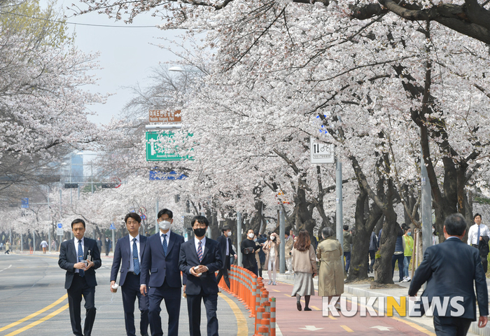 [쿠키뉴스] 박효상 기자 = 코로나19 확산 방지를 위해 여의도 벚꽃축제가 취소된 가운데 1일 오후 국회의사당 뒤편 여의서로(윤중로)에서 시민들이 벚꽃을 즐기고 있다.