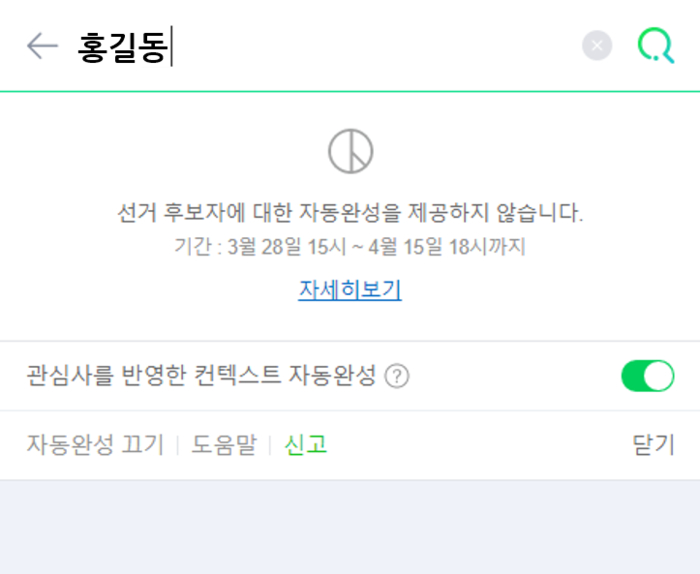 후보자명 검색 시 자동완성 및 검색어 제안 기능도 중단된다. 후보자 등록이 완료된 3월 28일 15시부터, 네이버 검색창에 국회의원 후보자명을 입력했을 때 자동완성 기능이 제공되지 않고 있다.
