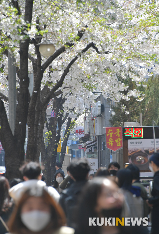 [쿠키뉴스] 박효상 기자 = 3일 오후 서울 동작구 만양로 학원가 차도에 핀 벚꽃이 지고 있다.