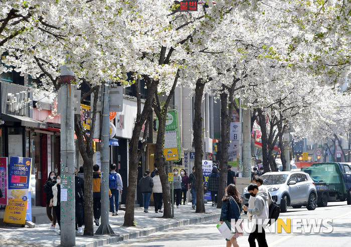 [쿠키뉴스] 박효상 기자 = 3일 오후 서울 동작구 만양로 학원가 차도에 핀 벚꽃이 지고 있다.