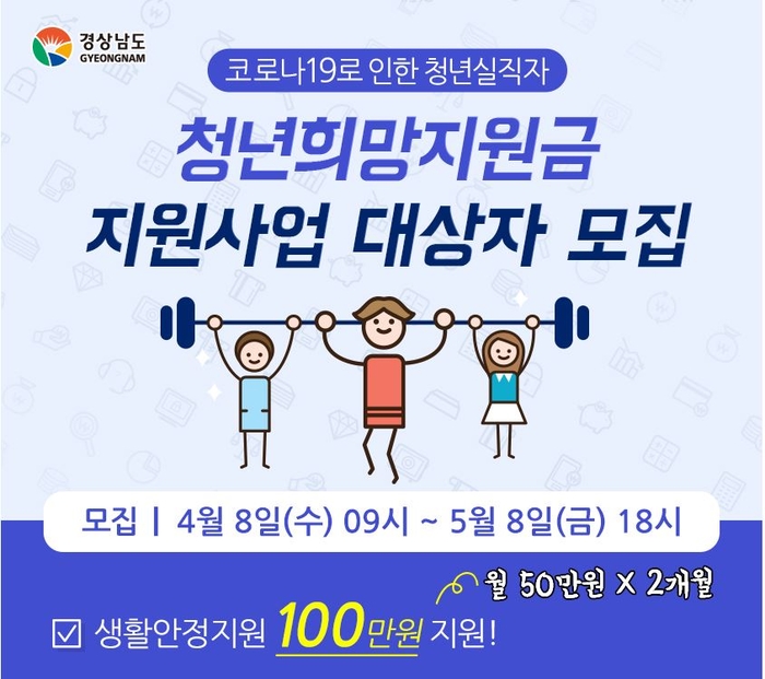 경상남도와 공동 추진하는 이 사업은 코로나19 확산으로 기간제·일용근로·아르바이트 등에서 비자발적으로 퇴직하거나 해고된 청년의 생활안정과 사회진입활동 촉진을 위한 사업이다.