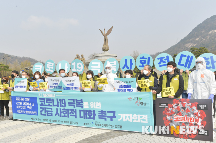 [쿠키뉴스] 박효상 기자 = 전국보건의료산업노동조합 소속 조합원들이 세계보건의 날인 7일 오전 청와대 분수대 앞에서 코로나19 극복을 위한 긴급 사회적 대화를 촉구하는 기자회견을 열었다.