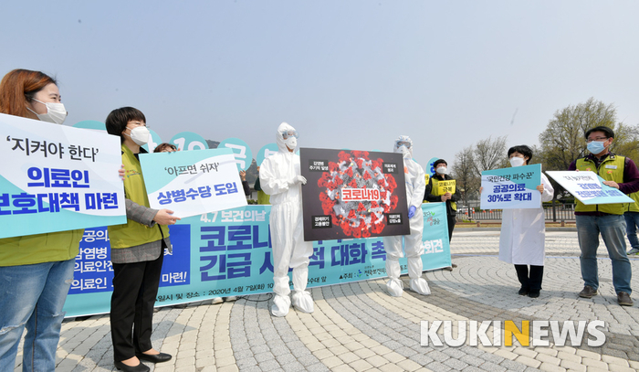 이날 조합원들은 감염병전문병원 설립 및 치료체계 구축, 공공의료 대폭 확충, 상병수당 도입, 의료인 보호조치와 인력 확충 등을 촉구했다.