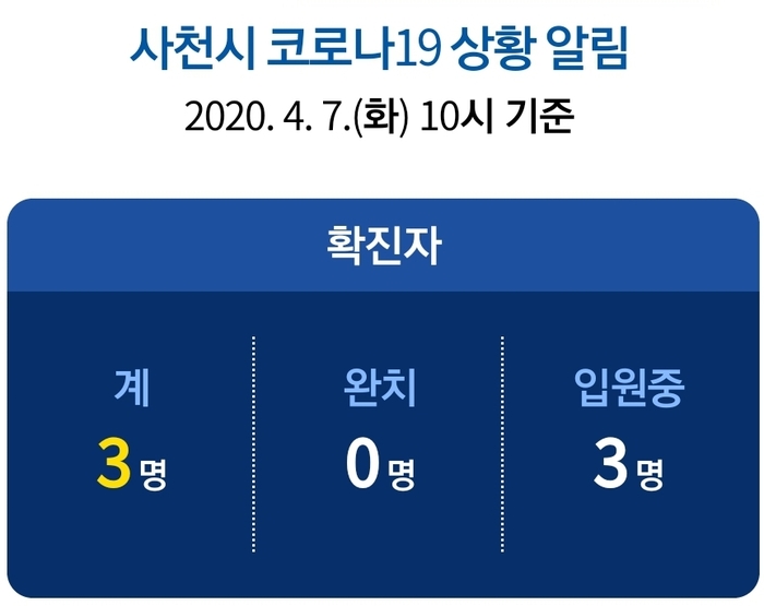 [사천=쿠키뉴스] 강연만 기자 = 경남 사천시에서 7일 오전 11시 기준 추가 1명이 확진 판정을 받아 3명으로 늘어났다.