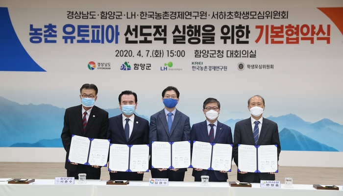 [진주=쿠키뉴스] 강연만 기자 = LH(사장 변창흠)가 7일 경남 함양군청에서 경상남도, 함양군, 한국농촌경제연구원, 서하초학생모심위원회와 함께 '농촌 유토피아 선도적 실행을 위한 기본협약'을 체결했다.