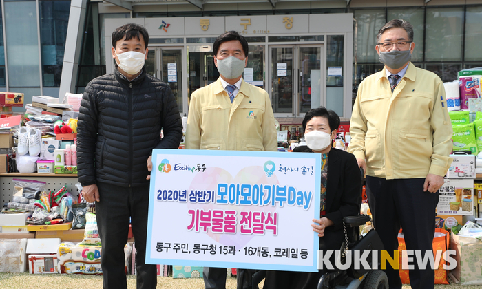 [대전=쿠키뉴스] 최문갑 기자 =대전 동구(구청장 황인호)는 7일 동구청 1층 잔디광장에서 2020년 상반기 천사의 손길 ‘모아모아 기부Day’ 전달식을 가졌다.