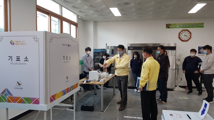 [사천=쿠키뉴스] 강연만 기자 = 경남 사천시(시장 송도근)가 사전투표 하루 전인 9일 제21대 국회의원선거를 위한 관내 14개소 사전투표소를 설치하고 사전점검을 실시했다.