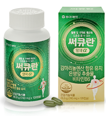 ▷동아제약, 건강기능식품 ‘써큐란 알파’ 출시=동아제약은 기존 일반의약품 혈액순환개선제 ‘써큐란’을 건강기능식품으로 전환한 ‘써큐란 알파’를 출시했다고 13일 밝혔다. 회사에 따르면 써큐란 알파에는 기억력 및 혈행 개선에 도움을 줄 수 있는 은행잎 추출물, 혈중 콜레스테롤 및 혈행 개선에 도움을 줄 수 있는 감마리놀렌산, 혈액의 호모시스테인 수준을 정상으로 유지하는 데 필요한 비타민 B6 등이 함유됐다. 써큐란 알파의 섭취 방법은 1일 1회, 1회 2캡슐로 이며 약국에서 구입할 수 있다. 회사는 써큐란 알파와 써큐란 오메가-3 등 다양한 제품을 지속적으로 선보일 예정이라고 전했다.