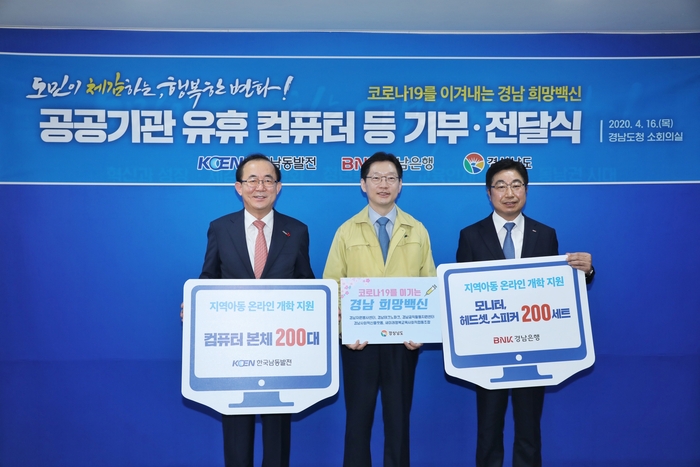 [진주=쿠키뉴스] 강연만 기자 = 한국남동발전(사장 유향열)이 16일 경상남도청에서 김경수 경상남도지사, 유향열 한국남동발전 사장, 황윤철 BNK경남은행장 등이 참석한 가운데 코로나19의 장기화로 인한 온라인 개학에 대비해야 하는 저소득층 학생들을 위해 리뉴얼 컴퓨터 200대를 전달했다.